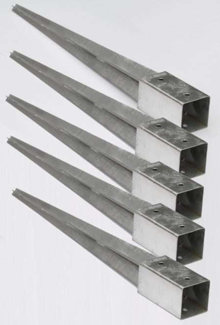 5 feuerverzinkte Einschlaghülsen für die schnelle Montage von Zaunpfosten ohne Betonieren.
