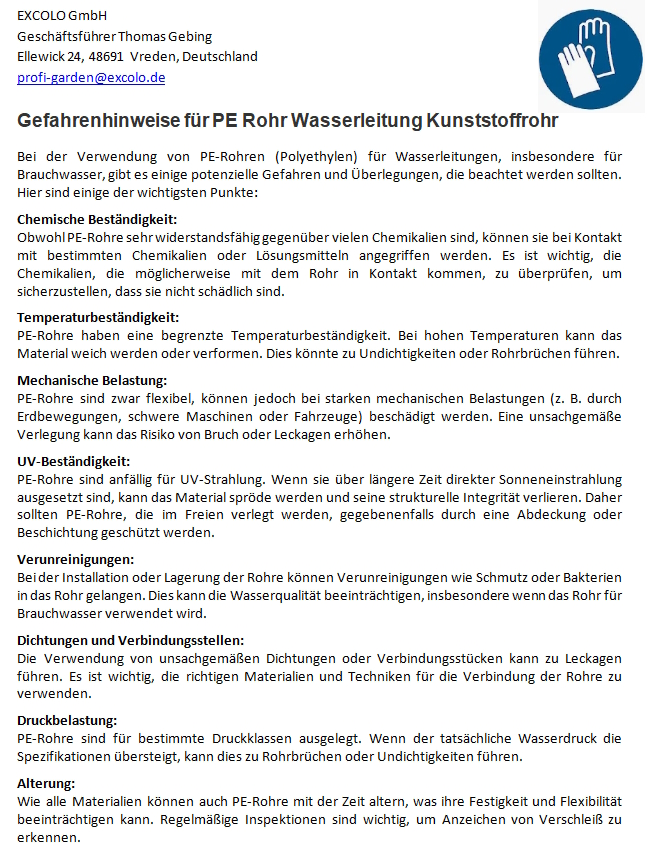 Werkstoff/Qualität: PE100(= MRS 10,0 N/mm²)
