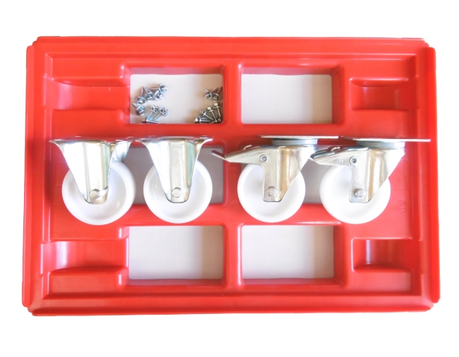 Der Transportroller wird als Bausatz geliefert. Die 4 Rollen müssen noch mit einem 10 er Schlüssel oder besser mit einer Ratsche mit 10 Nuss am Rahmen befestigt werden. Die 16 Schrauben werden mitgeliefert.